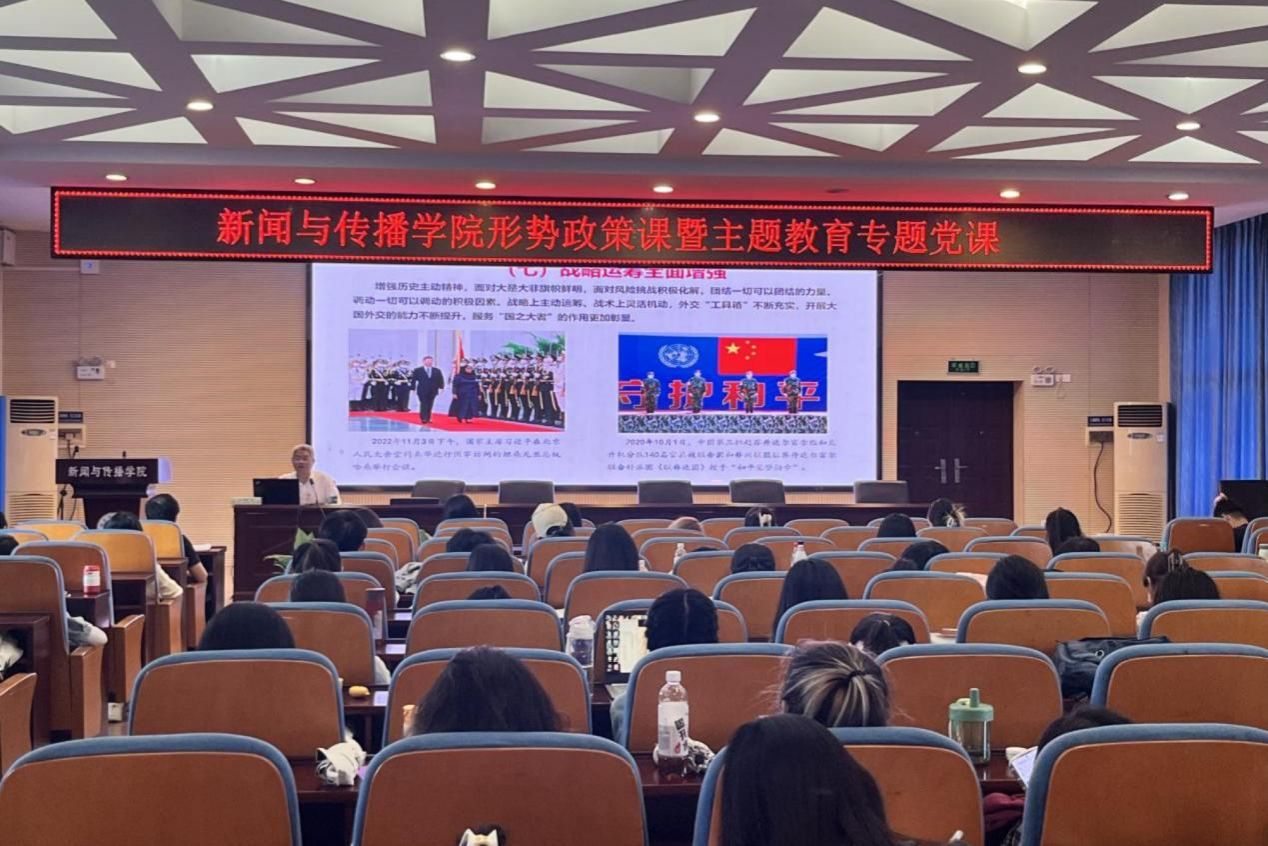 (通讯员 魏唯 陈红旭)5月18日下午,副校长唐贤清教授为新闻与传播学院师生讲授了以“新时代中国特色大国外交回眸与展望”为主题的形势与政策课暨主题教育专题党课。党课由新闻与传播学院党委书记沈贤岚主持。
