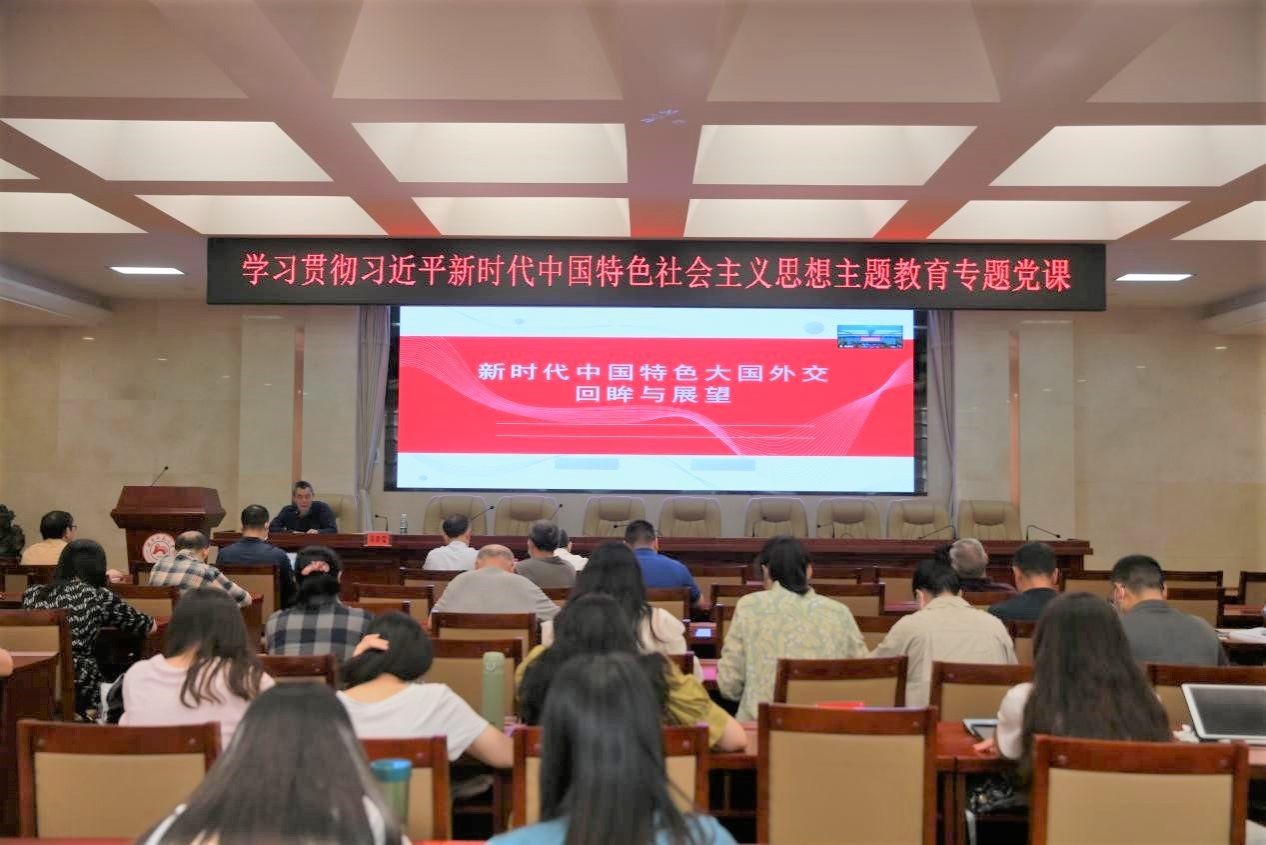 蒋新苗列举新时代中国特色大国外交取得的多项开创性、历史性成就,并介绍中国在全球化和多极化趋势的影响下面临的机遇和挑战,着重讲解中国外交在促进公平正义方面所做出的全面贡献。他表示,中国的国际地位和影响力不断提升,但也遭遇来自一些国家的压力和挑战。因此,中国需要更加积极地构建新型国际关系,强化与各国的合作与沟通,共同推动世界和平与发展。他希望全体教职工和党员认真学习贯彻习近平新时代中国特色社会主义思想,深入理解和把握新时代中国特色大国外交的内涵和要义,不断提升自己的国际视野和综合素质,为促进世界和平与稳定作出贡献。