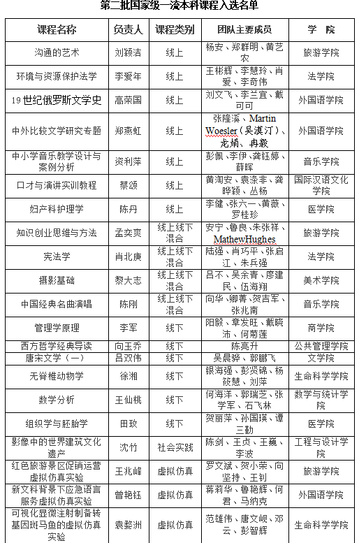 (通讯员 刘飞)近日,《教育部华体会平台公布第二批国家级一流本科课程认定结果的通知》(教高函〔2023〕7号)正式下发,认定5750门课程为第二批国家级一流本科课程。我校新增21门课程,其中线上一流课程7门,线上线下混合式一流课程4门,线下一流课程6门,社会实践一流课程1门,虚拟仿真实验教学一流课程3门。