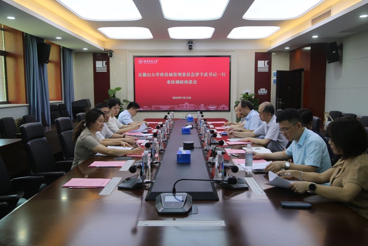 (记者 刘偲睿)近日,岳麓山大学科技城管理委员会罗予武书记一行来我校调研并召开座谈会,我校副校长杨震出席会议。会议由我校资产经营管理有限公司(大科城办公室)总经理(主任)蔡炳华主持。