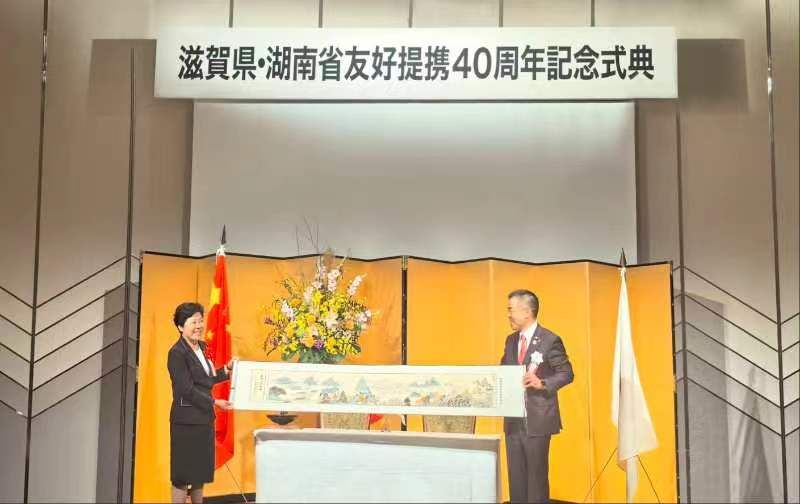 (供稿 语言与文化研究院)11月10日至11日,省委常委、市委书记吴桂英代表湖南省委、省政府率团访问滋贺县,与滋贺县知事三日月大造会谈,并共同出席湘滋结好40周年庆典等活动。其间,我校研发、绣制的“潇湘八景”国家级非遗湘绣长卷等作品被遴选为湖南省人民政府定制礼品赠予滋贺县政府。