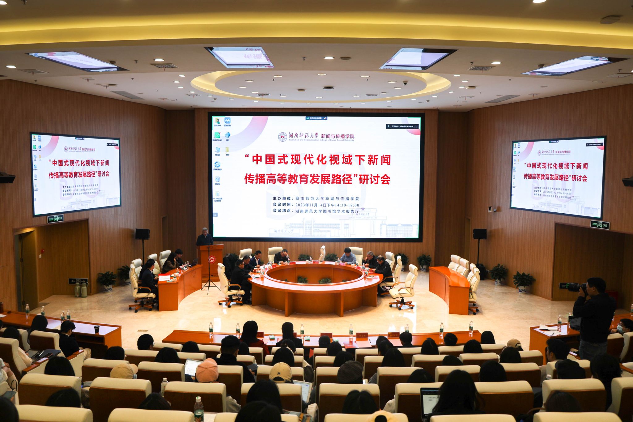 (记者 刘偲睿 项和烽)11月14日,我校新闻与传播学院主办的“中国式现代化视域下新闻传播高等教育发展路径”学术研讨会在图书馆学术报告厅召开。研讨会以线上线下同步方式进行,来自中国人民大学、中国传媒大学、复旦大学、清华大学、北京大学等十余所大学的新闻与传播学院院长以及专家学者参会。我校副校长唐贤清出席开幕式。开幕式由我校新闻与传播学院党委书记沈贤岚主持。