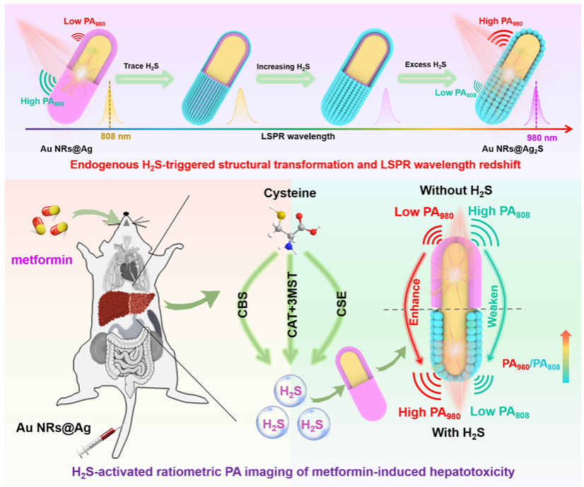 基于此,曾松军教授课题组发展了内源性H2S触发的局域表面等离子体共振(LSPR)调控新策略,设计了一种精确可靠的新型纳米探针(Au NRs@Ag),用于体内H2S的实时动态比率光声成像。设计的Au NRs@Ag纳米探针被H2S激活后原位形成Au NRs@Ag2S结构。这种结构转变可以实现LSPR波长的精确调控(808-980 nm),并成功实现了二甲双胍诱导肝损伤疾病的动态比率光声成像。