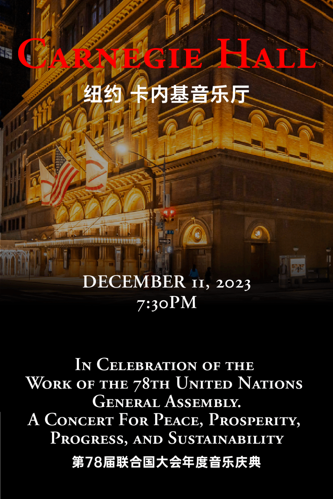 (记者 马铁泉)第78届联合国大会年度音乐庆典于纽约时间2023年12月11日晚7:30在著名的音乐殿堂——卡内基音乐厅(Carnegie Hall)隆重举办。我校潇湘学者特聘教授,著名小提琴演奏家、指挥家、音乐教育家,音乐之帆创始人柴亮,受联合国大会主席办公室(UNGA78)和联合国训研所(UNITAR)的邀请参加此次音乐会。