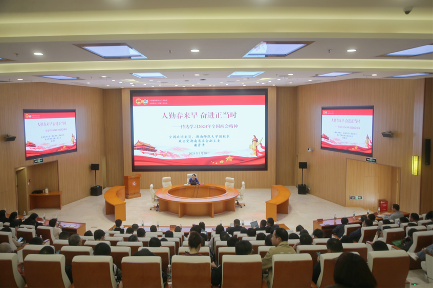 谢资清传达了十四届全国人大二次会议精神与全国政协十四届二次会议精神,她从2023年工作回顾、2024年经济社会发展总体要求和政策取向以及2024年政府工作任务等三部分对2024年政府工作报告进行了详细解读,重点阐释了有关教育、科技和创新的内容以及两会新词热词,介绍了驻湘全国政协委员履职情况和个人履职情况。谢资清表示,自己作为政协委员,必当为国履职、为民尽责。