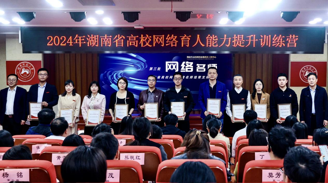 (供稿 学生工作部)3月26日至3月29日,2024年湖南省高校网络育人能力提升训练营在我校顺利举行,中共湖南省委教育工委宣传部、湖南省教育厅思政处一级调研员陈解,我校副校长王辉为学员颁发结业证书并为第三批“湖南省高校网络教育名师培育支持计划”入选者授牌。开班和结业仪式由学生工作部副部长罗元主持。