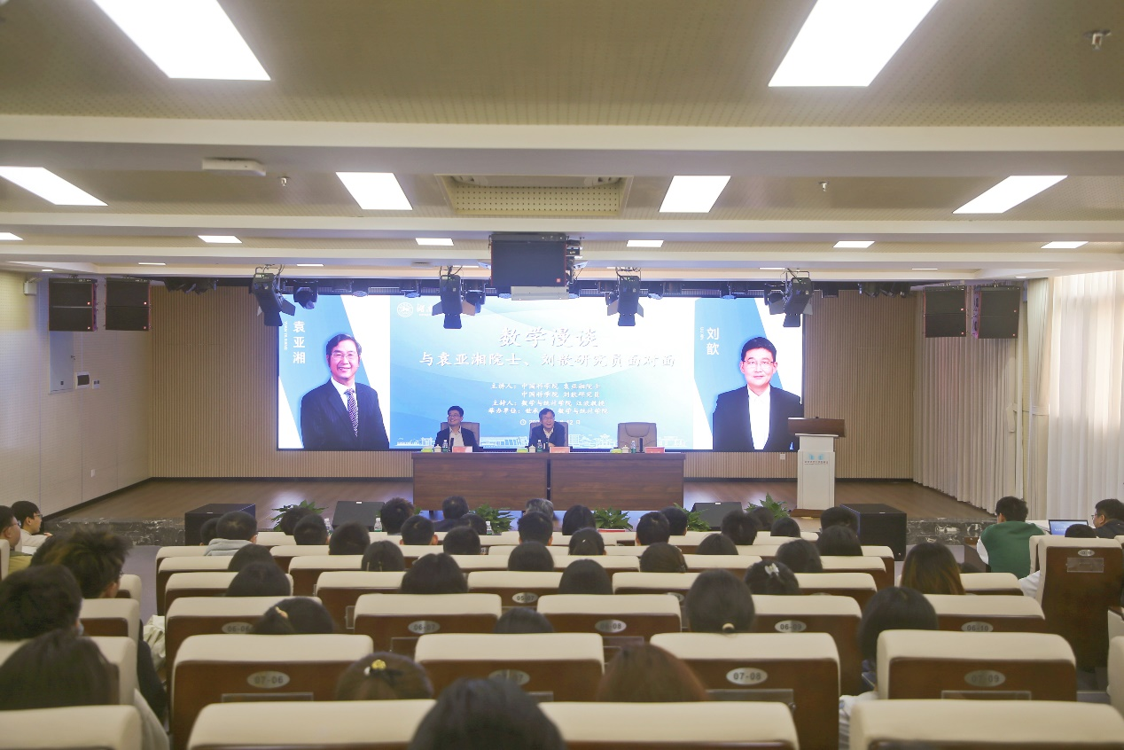 在交流互动环节,与会学生从如何平衡学科竞赛与专业成绩、如何体会数学之美等方面进行提问,袁亚湘、刘歆为同学们解答。