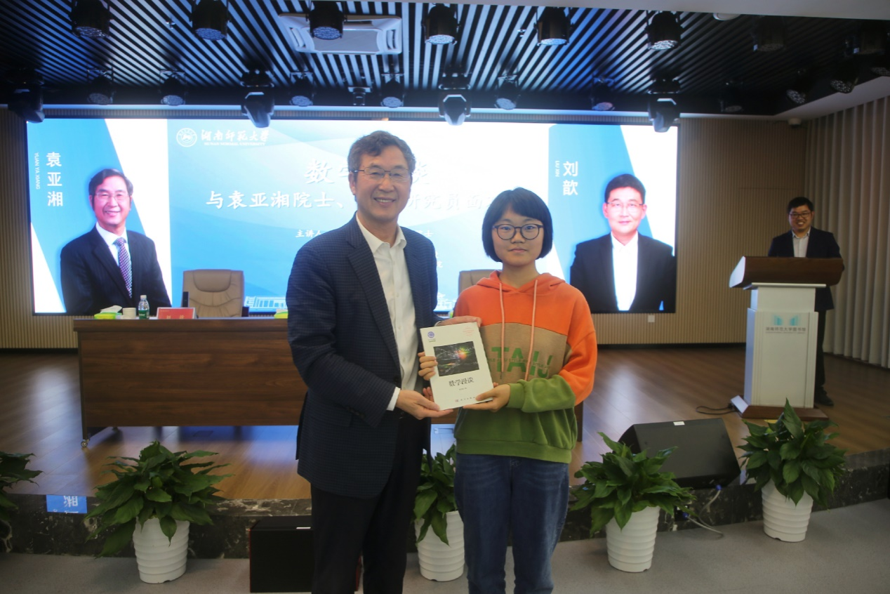 袁亚湘向提问学生赠送书籍并合影留念。