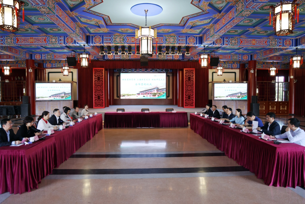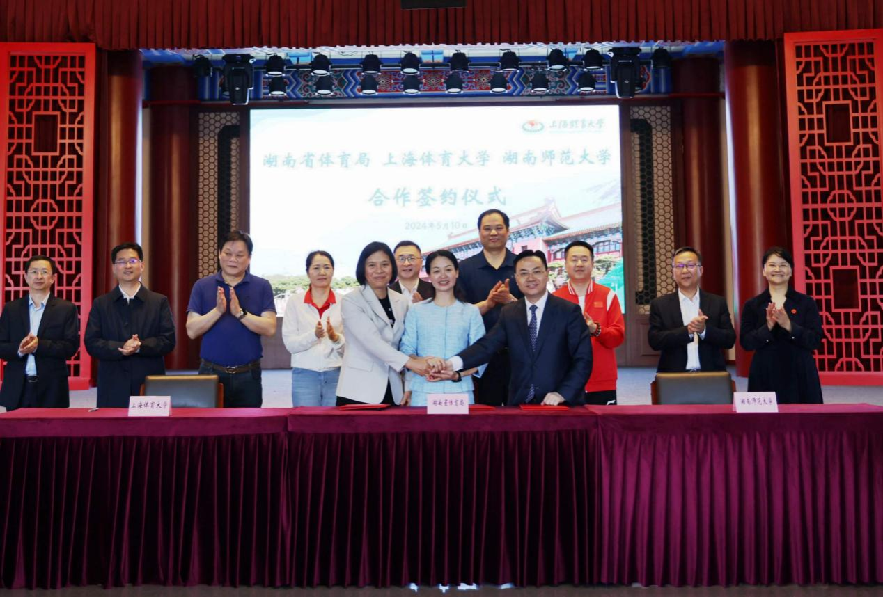 (供稿 发展规划与学科建设处)5月10日,我校与湖南省体育局、上海体育大学在上海体育大学绿瓦大楼举行合作签约仪式,决定合作开展“省队校建”和共建省乒乓球青训基地。湖南省体育局局长罗双全,党组成员、副局长张连标,上海体育大学党委书记李崟、校长毛丽娟,我校校长、中共第二十届中央候补委员、中国工程院院士刘仲华出席签约仪式。上海体育大学党委副书记、中国乒乓球学院党委书记杨玲主持签约仪式。