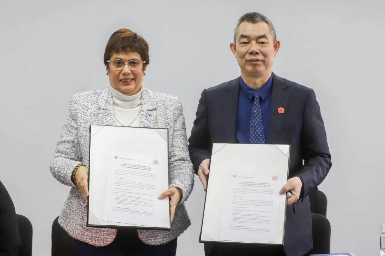 在秘鲁塞萨尔瓦列霍大学访问期间,该校校长珍妮特坦塔丽以及首席执行官凯莉阿库娜热情接待了访问团一行。蒋新苗简要介绍了我校办学历史,并回顾了两校合作交流历史,重点介绍了我校法学以及外国语言文学等专业的发展情况,希望以此次访问为契机,推动双方在法学、西班牙语、拉丁美洲文化研究等领域的交流与合作。双方就联合科研、师生交换、合办中文教学中心等议题进行了深入交流,并签署了合作备忘录。
