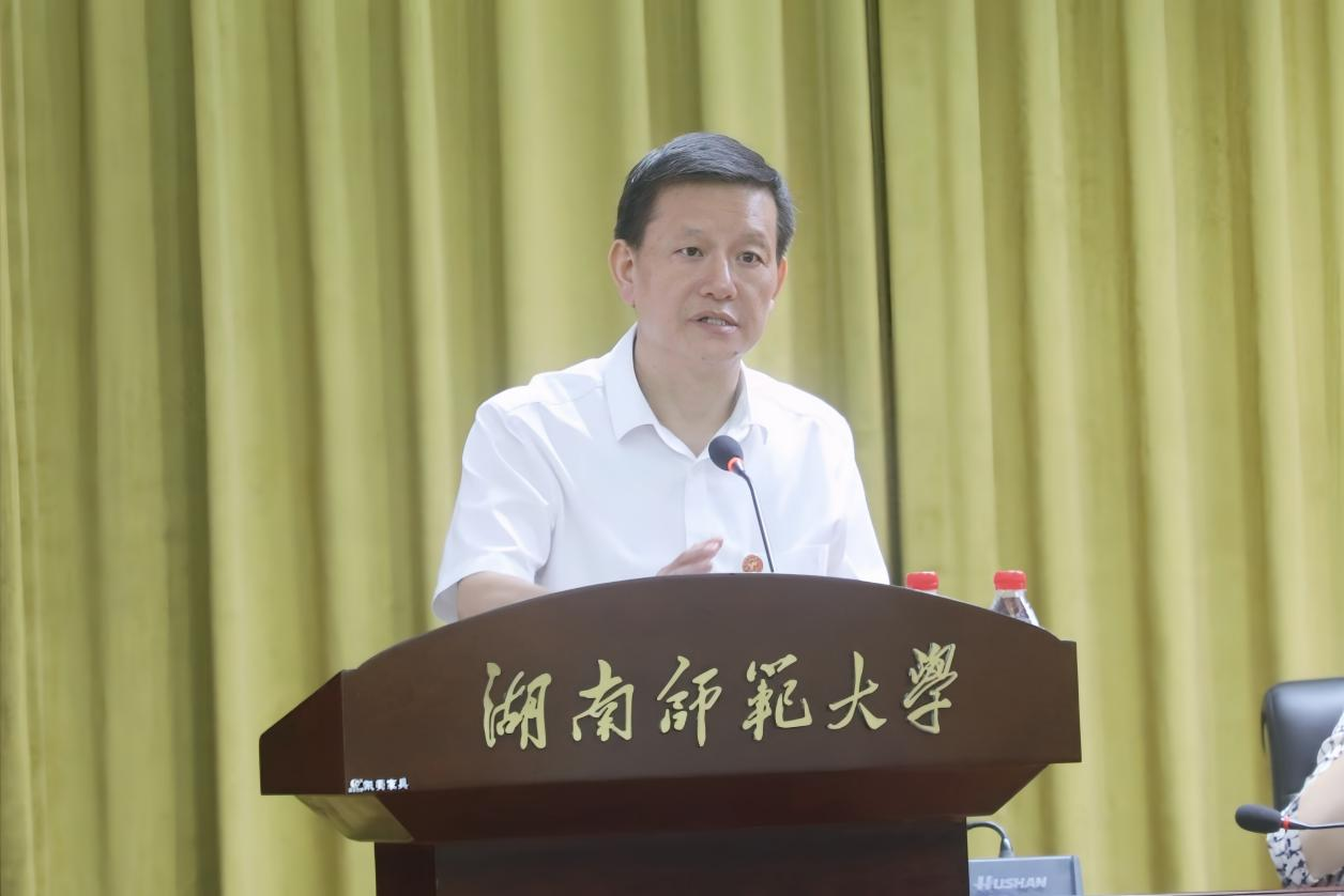 蒋洪新向暑假期间坚守岗位、辛勤工作的同志们表示感谢。他简要总结回顾了今年上半年学校改革发展中的标志性成果,并就贯彻落实中央、省委的决策部署,落实省委领导的指示要求,谋划推进学校事业发展,提出了五点要求:一是要深入贯彻全会精神,坚定正确办学方向。要提高政治站位,把学习好、宣传好、贯彻好党的二十届三中全会精神作为当前和今后一个时期的首要政治任务,坚持在深学笃行上下功夫,在抓好党的建设上下功夫,围绕“中国式现代化”“高质量发展”主题进行深入研讨,把师生员工的思想统一到“四个服务”的办学方向上来,探索更加卓越的创新型大学建设。二是要不断优化学科布局,推进学校高质量发展。要主动对接国家和湖南省重大战略需求,聚焦重点学科、优势学科和新兴学科发力,深入推进新工科、新医科、新文科改革,为中国式现代化建设做贡献。三是要统筹调整专业设置,提高人才培养质量。要立足实际,着眼长远,深化教育教学改革,推动专业发展和育人水平的迭代升级,培养符合新时代要求的高素质创新人才。四是要推进人事机构改革,全面提升管理效能。要以内设机构编制改革为契机,推进人事制度和绩效分配改革,强化干部培养管理,健全能上能下的选人用人机制,使职工更有获得感和幸福感。五是要凝心聚力团结奋斗,建设和谐美好校园。要着力培育团结向上的校园文化,建设好师大命运共同体,调动一切可以调动的资源,凝心聚力、抢抓机遇、实干笃行,不断开创学校“双一流”建设新局面,以优异成绩迎接新中国成立 75 周年。