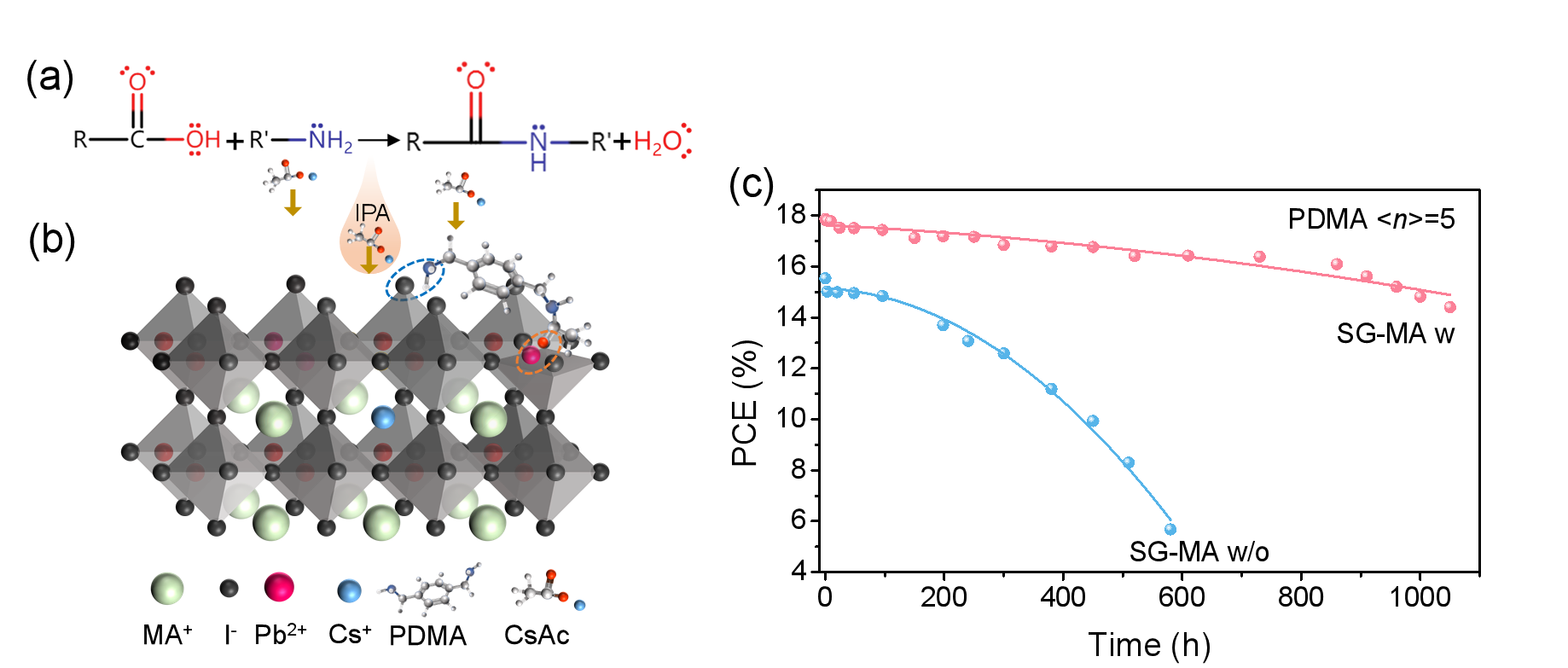 图1.乙酸铯诱发的缩聚反应(a)及其缺陷钝化和组分重构示意图(b),(PDMA)MA4Pb5I16基准二维钙钛矿太阳能电池在光照(1个太阳)和高温(85℃)下的PCE随时间变化曲线(c)。