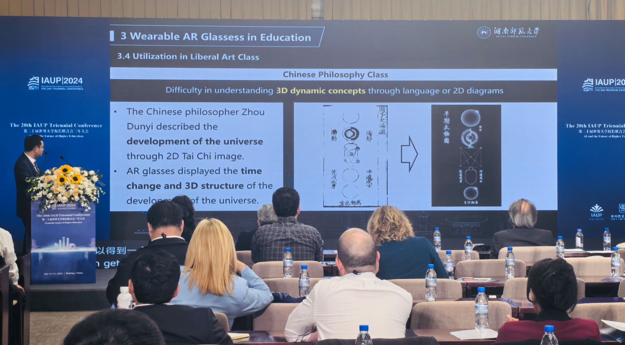 潘安练作题为“人工智能与个性化教育(Artificial Intelligence and Personalized Education)”的英文演讲。他表示,人工智能具有突破时间、空间界限的特性,赋能教育将弥补传统教育发展所面临的困境,延展教育的深度和广度。他从“人工智能+教育”实施所需的软件、硬件两个层面分别介绍了我校教师教育AI大模型研发以及搭载其团队主持研发的Micro-LED微显示芯片的AR眼镜应用于教育创新的情况,展示了外国语言文学等学科基于“AI大模型+AR眼镜”在“湖湘文化传承传播”等课程上多维度阐释周敦颐《太极图说》、多模态呈现“潇湘八景”文学意境和个性化图书推荐导览系统等应用案例。