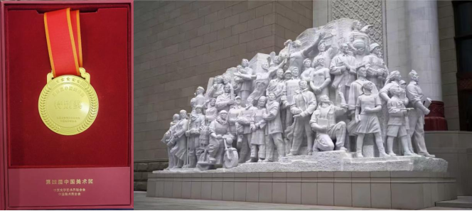 (供稿 美术学院)近日,第四届“中国美术奖”颁奖仪式在中国国家博物馆举办。本届“中国美术奖”共评选产生金奖9件、银奖14件、铜奖17件,我校美术学院美术系主任谭建明参与创作(排名第三)的中国共产党历史展览馆主题雕塑《伟业》获得特别奖。