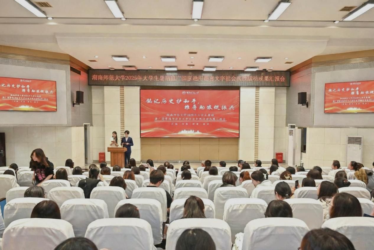 在成果汇报环节,优秀实践团队依次登台,通过视频展示、情景再现、数据呈现等多元形式,展示了暑期社会实践成果。今年暑期,各团队深入湖南多地乡镇,通过推普教学、语言调研与直播助农服务乡村振兴,并结合抗战胜利80周年主题宣讲红色文化,充分展现了青年学子服务基层、以言赋能的使命担当。