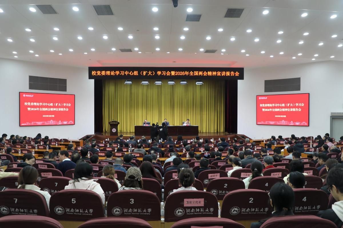 (记者 马铁泉 吴乐 黄依依)3月26日下午,校党委理论学习中心组(扩大)学习暨2026年全国两会精神宣讲报告会在国际学术报告厅举行。全体在家校领导、党委委员,全体中层干部和部分师生代表现场参会,各二级党组织师生通过线上直播同步学习。校党委副书记、校长刘仲华主持会议。