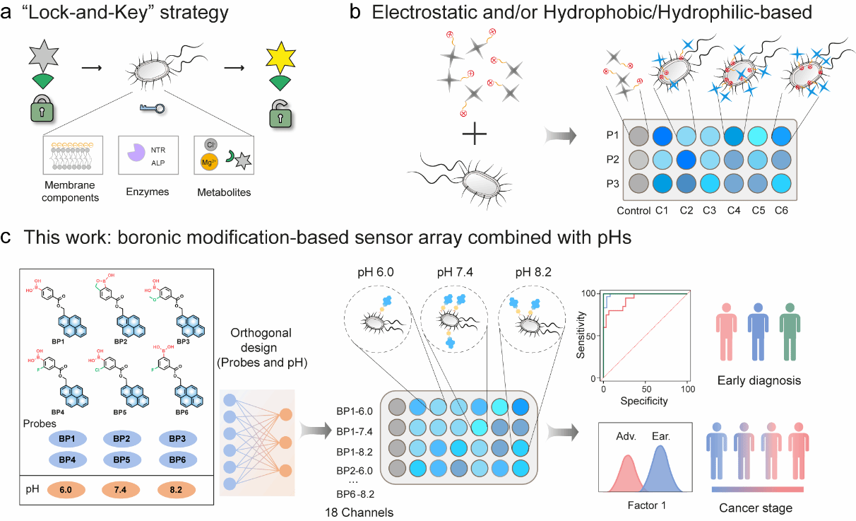 传统肠道菌群分析依赖16S rRNA测序或宏基因组学,成本高、耗时长、需专业设备。本工作首次构建了GUT-SCAN(Gut Unique Typing via Spectral and Chemical Analysis using Boronic Acid Nanosensor)——一种基于苯硼酸的荧光传感器阵列,通过6种pH响应型苯硼酸-芘衍生物探针(BP1-BP6)结合3种pH环境(6.0、7.4、8.2)组成18通道传感器阵列,利用探针苯硼酸结构单元与细菌表面顺式二醇结构的可逆共价结合(pH依赖),通过引入不同推电子/拉电子基团改变硼原子的微环境,进而精准调控探针pKa值,实现对不同细菌表面多糖/糖蛋白的差异化结合,在无需基因扩增/测序的情况下,快速生成独特的荧光“指纹图谱”;芘作为荧光报告基团,细菌黏附后荧光显著增强,形成多维响应模式;结合机器学习算法,实现菌株级区分+结直肠癌分期诊断,为微生物组学和癌症非侵入性诊断提供了快速(<30min)、廉价、高通量的全新技术平台。该平台彻底摆脱了“锁-钥”特异性识别的局限,为复杂微生物组学提供了一种快速、廉价、无标记的通用指纹分析新范式。