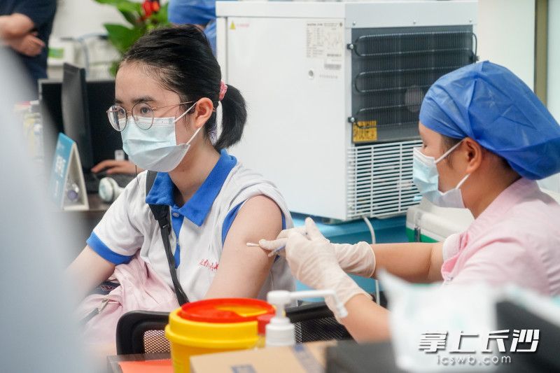 湖南师大附中副校长苏建祥介绍,学校联合了长沙三真卫生服务中心、长沙市第四医院在校集中为学生接种。为确保安全有序开展新冠疫苗接种,学校安排学生分批错峰入校,并且设置了等候区、问诊区、接种区和留观区,而且还在每个区域都安排了志愿者做引导。