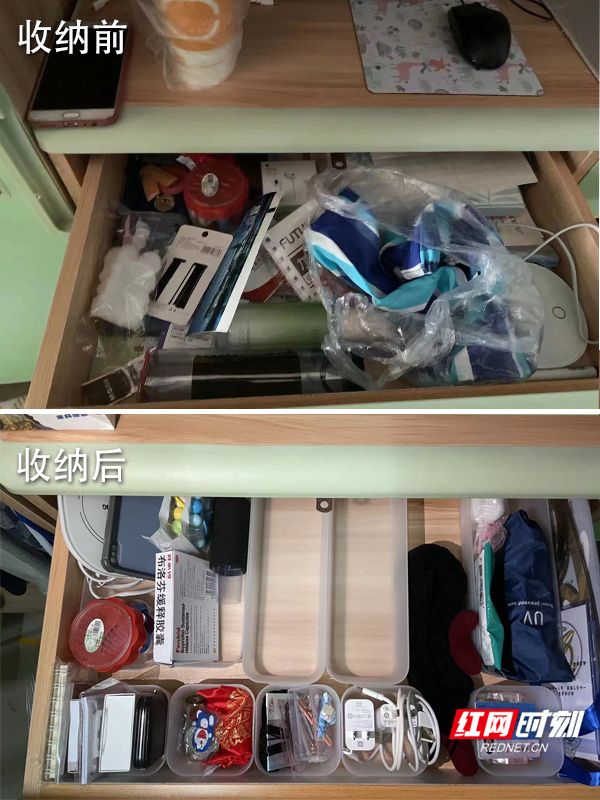 湖南师大学生听完讲座后回到寝室收纳整理前后的反馈照对比。