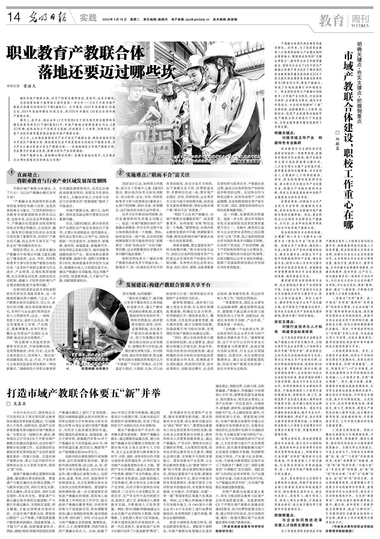 欧阳忠明认为,为直面且解决产教融合中的堵点问题,《意见》提出了建设政府、企业、学校、科研机构等多方参与的市域产教联合体的任务。“这有利于将职业教育与行业进步、产业转型、区域发展深度捆绑,充分发挥各自优势,创新良性互动机制,破解人才培养供给侧与产业需求侧匹配度不高等问题。”