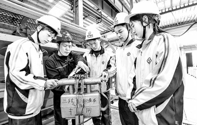4月3日,浙江物产中大线缆有限公司生产车间,湖州市技师学院学生在学习铜线焊接技术。王树成摄/光明图片