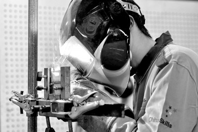2月10日,安徽省合肥市肥东县中专学校的钣金电焊实训室,学生进行气保焊操作实训。阮雪枫摄/光明图片