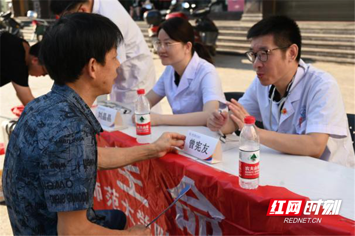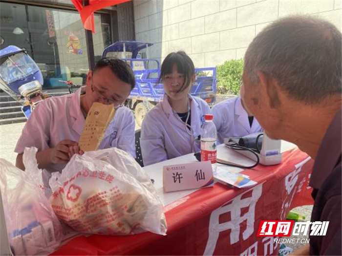 活动期间,湖南师大医学院师生和湖南航天医院专家教授为当地群众进行免费义诊活动,宣传普及健康常识和健康预防知识,并现场指导群众自助测血糖、量血压,提升群众通识健康预防技能。