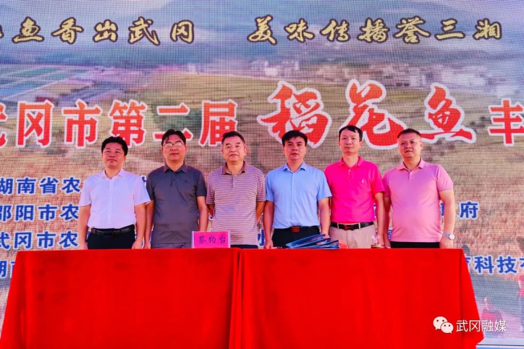 本次丰收节以“庆丰收 促和美”为主题,以城乡共庆、共祝、共享为主线,由中共武冈市委、武冈市人民政府主办,市农业农村局、水西门街道办事处、湖南庆丰投资发展有限公司、湖南省鱼类苗种繁育科技有限公司承办。开幕式上,湖南省鱼类苗种繁育科技有限公司与武冈教育系统营养餐配送中心签订稻渔香米和生态鱼采购协议,与邵阳市浩天米业签订稻花鱼销售协议。
