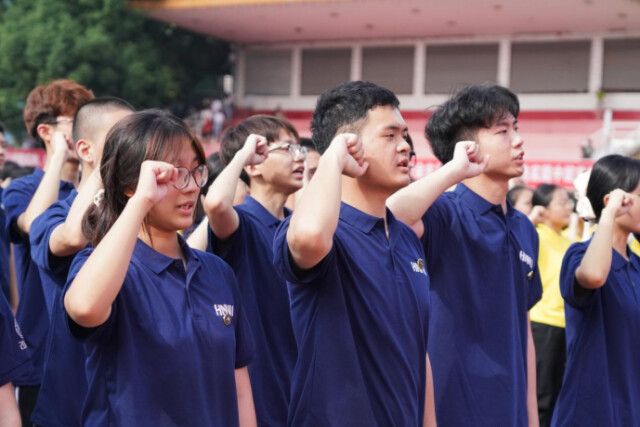 开学典礼在庄严的国歌声和激昂的校歌声中拉开帷幕。校女子国旗护卫队队员们手握钢枪,英姿飒爽,迈着整齐的步伐出旗护旗。着学校统一配发文化衫的全体2023级新生,庄重热烈,麓山扬帆,青春起航。