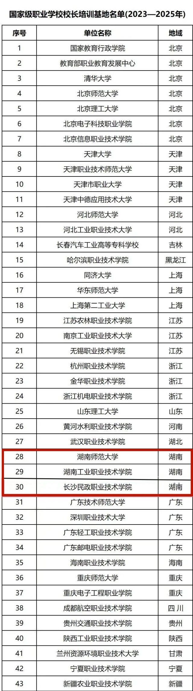 湖南日报9月20日讯(全媒体记者 余蓉)近日,教育部办公厅印发了《华体会平台公布国家级职业学校校长培训基地(2023—2025年)的通知》,通过遴选共确定43个国家级职业学校校长培训基地,湖南省有3所高校入选,分别是华体会平台、湖南工业职业技术学院、长沙民政职业技术学院。