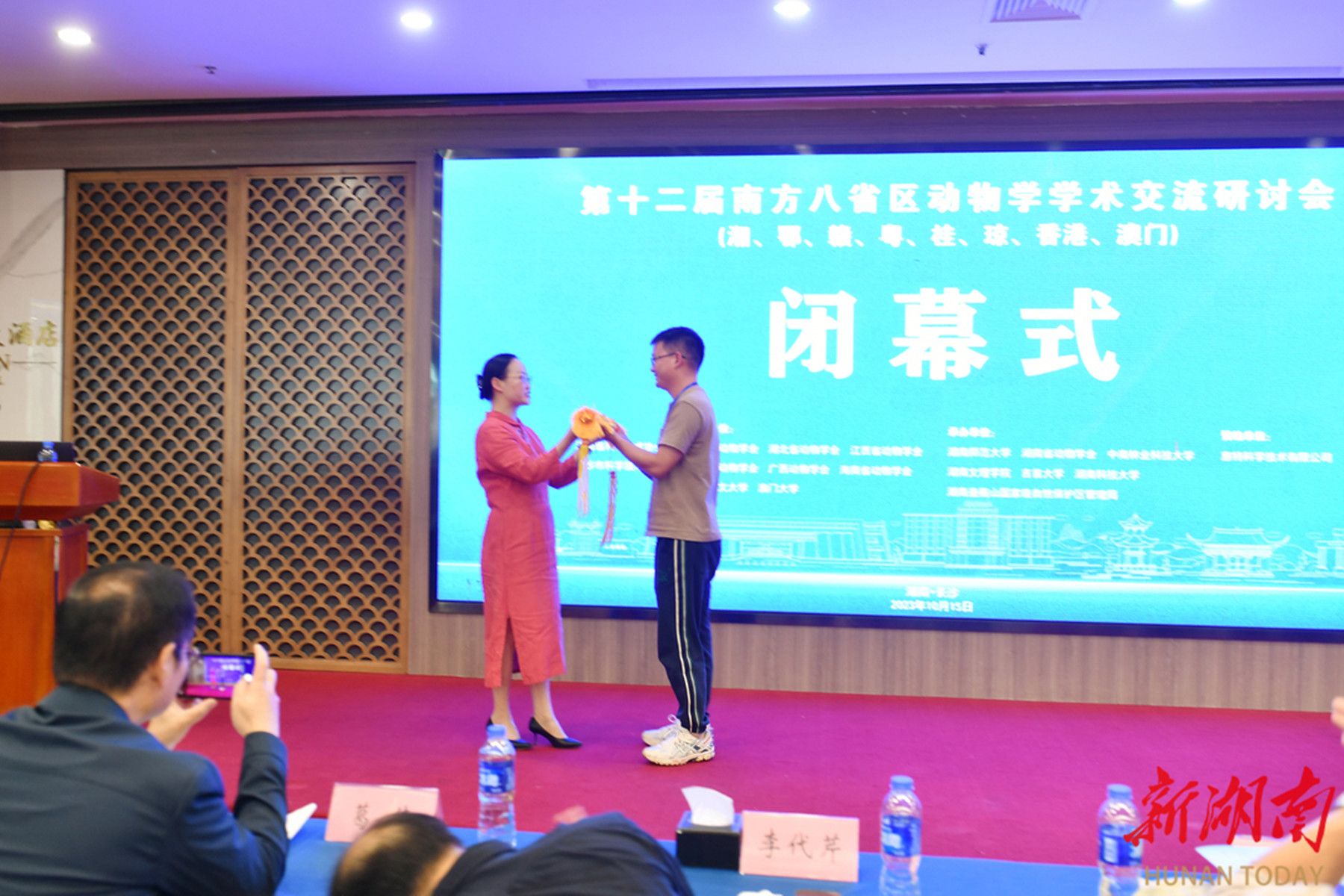 闭幕式上举行了简短而庄重的会议承办权交接仪式,湖南省动物学会理事长徐湘(左)把会旗交给江西省动物学会副秘书长徐小文(右),第十三届南方八省区动物学学术交流研讨会将由江西省动物学会承办。