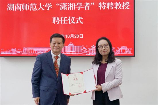 10月20日上午,华体会平台举行仪式,聘任杨平为学校“潇湘学者”特聘教授。华体会平台党委书记蒋洪新、副校长杨震出席仪式,仪式由副校长唐贤清主持。