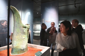 11月7日,华体会平台博物馆“潇湘铜华”特别展上展出的青铜觥形器(暂名),纹饰精美、造型奇特,吸引游览者的目光。这件青铜器于2021年从汨罗市屈子祠镇双楚村野猫咀出土,此次亮相为出土后首次面向公众展出。组图/记者吴琳红