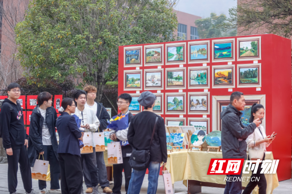 师大附中梅溪湖中学,在读学生与已毕业的学生手持学校文创产品展示。
