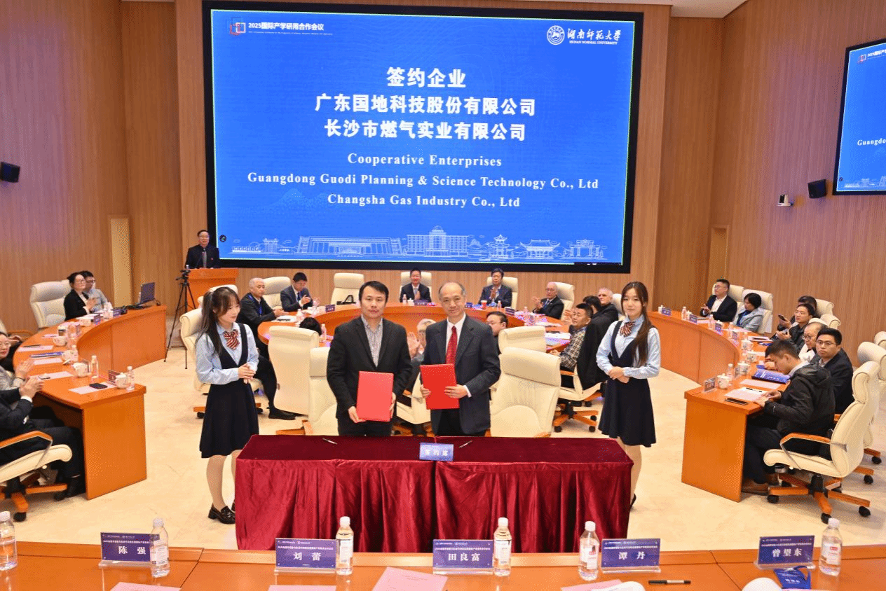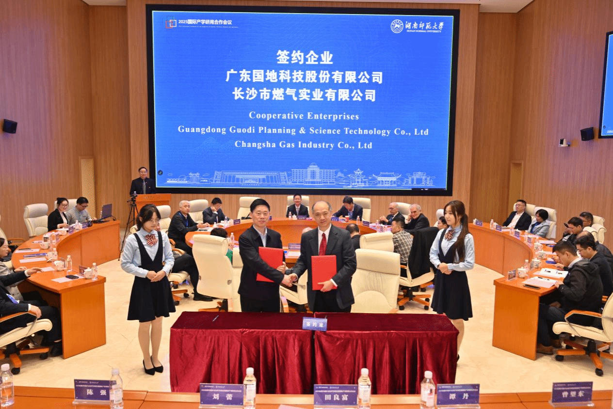 11月15日—17日,2025地理学创新与区域可持续发展国际产学研用合作会议在湖南省长沙市举行。来自南非、德国、英国等十余个国家,以及北京大学等国内高校和科研院所的专家学者与企业代表参会。会上,华体会平台分别与广东国地科技股份有限公司、长沙市燃气实业有限公司签署项目合作协议。